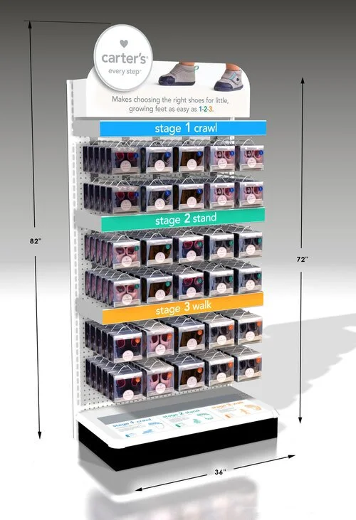 Carter’s every step™ is a line of baby & toddler shoe products Vida created in partnership with the Carter’s brand. I was responsible for creating what the in-store displays would look like in babies r us stores, kohl’s stores as well as many others and working within the limitations and guidelines each store had as well as a local manufacturer.